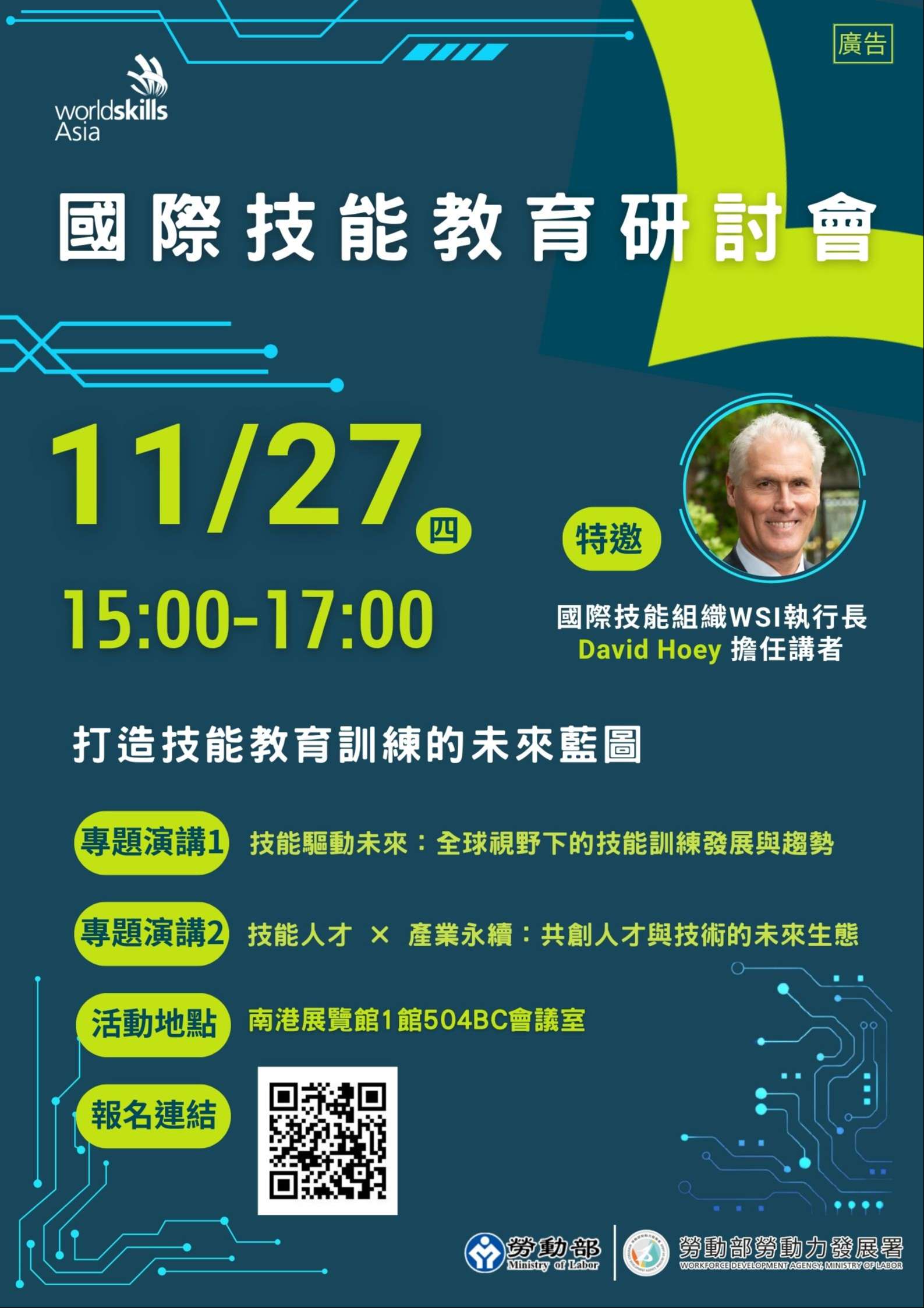 | 三、 | 本次專題演講主題為「技能驅動未來:全球視野下的技訓練發展與趨勢」及「技能人才x產業永續:共創人才與技術的未來生態」,並邀請國際技能組織(WorldSkills International, WSI)執行長David Hoey擔任講者之一,期藉交流分享產業創新、技能人才培育及教育發展之成功案例。 |
