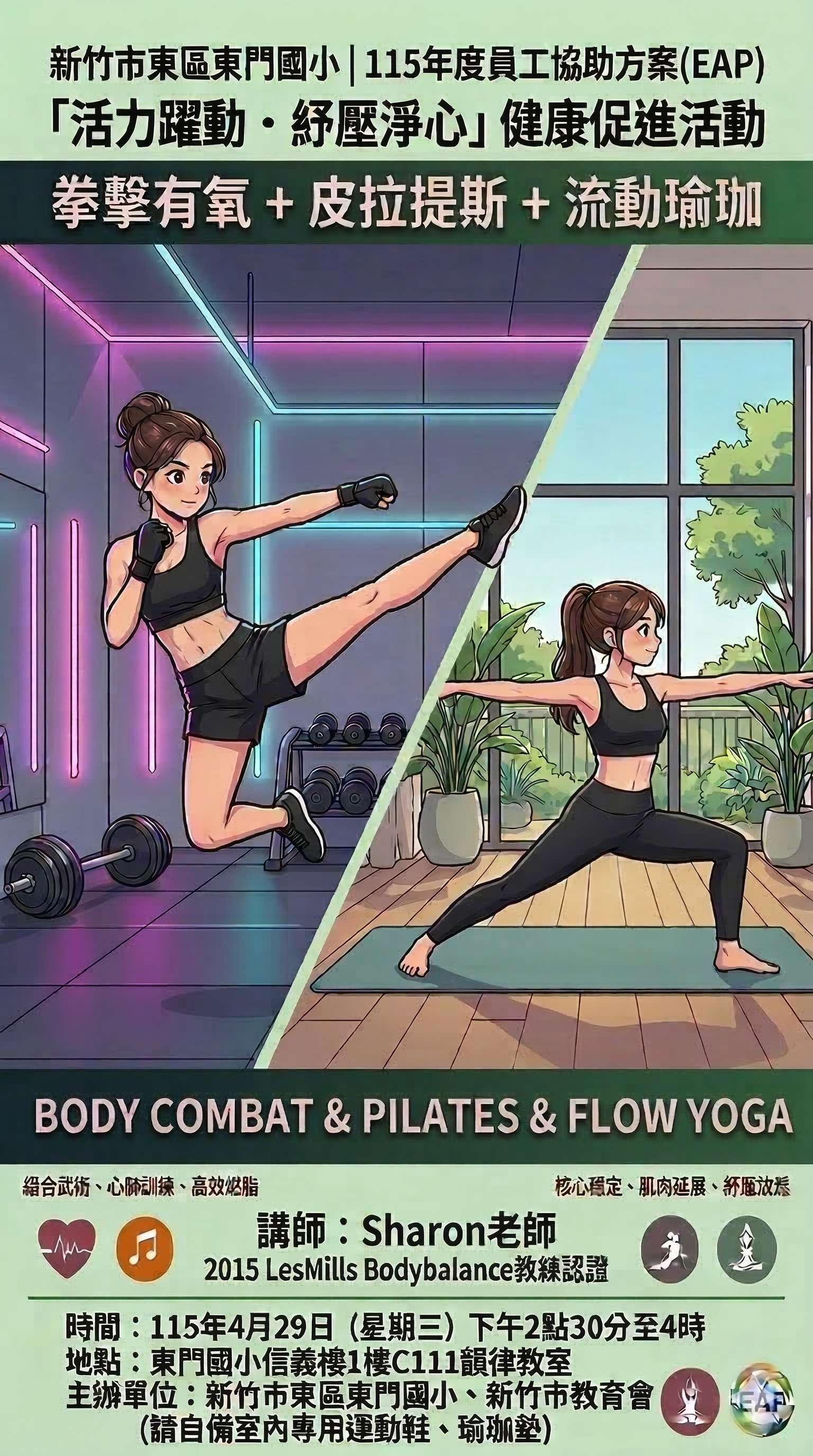 一、有關新竹市東區東門國民小學115年3月16日書函以,該校謹訂於115(本)年4月29日(星期三)下午辦理「115年度推動員工協助方案(EAP)『活力躍動.紓壓淨心』拳擊有氧與皮拉提斯健康促進活動」,歡迎所屬踴躍報名參加一案。