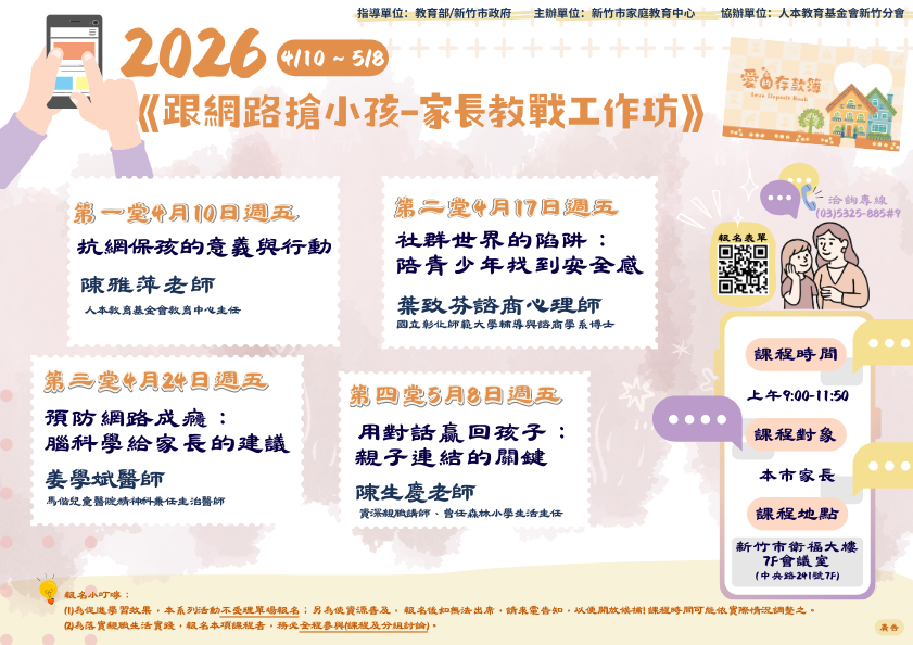促進家長理解如何預防孩子網路成癮,新竹市家庭教育中心定於4月10日起舉辦「跟網路搶小孩-家長教戰工作坊」系列,鼓勵家長踴躍報名